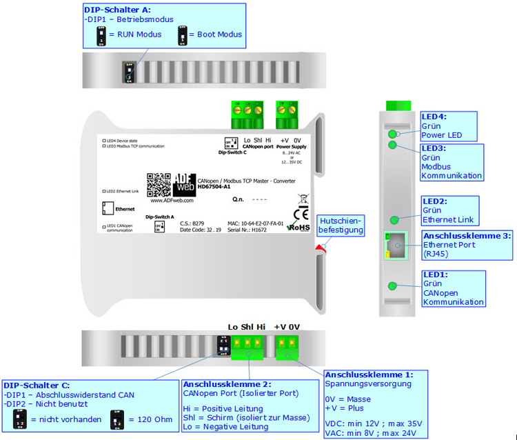 - Galvanische 3-Wege Trennung zwischen CANopen / Ethernet und Versorgung